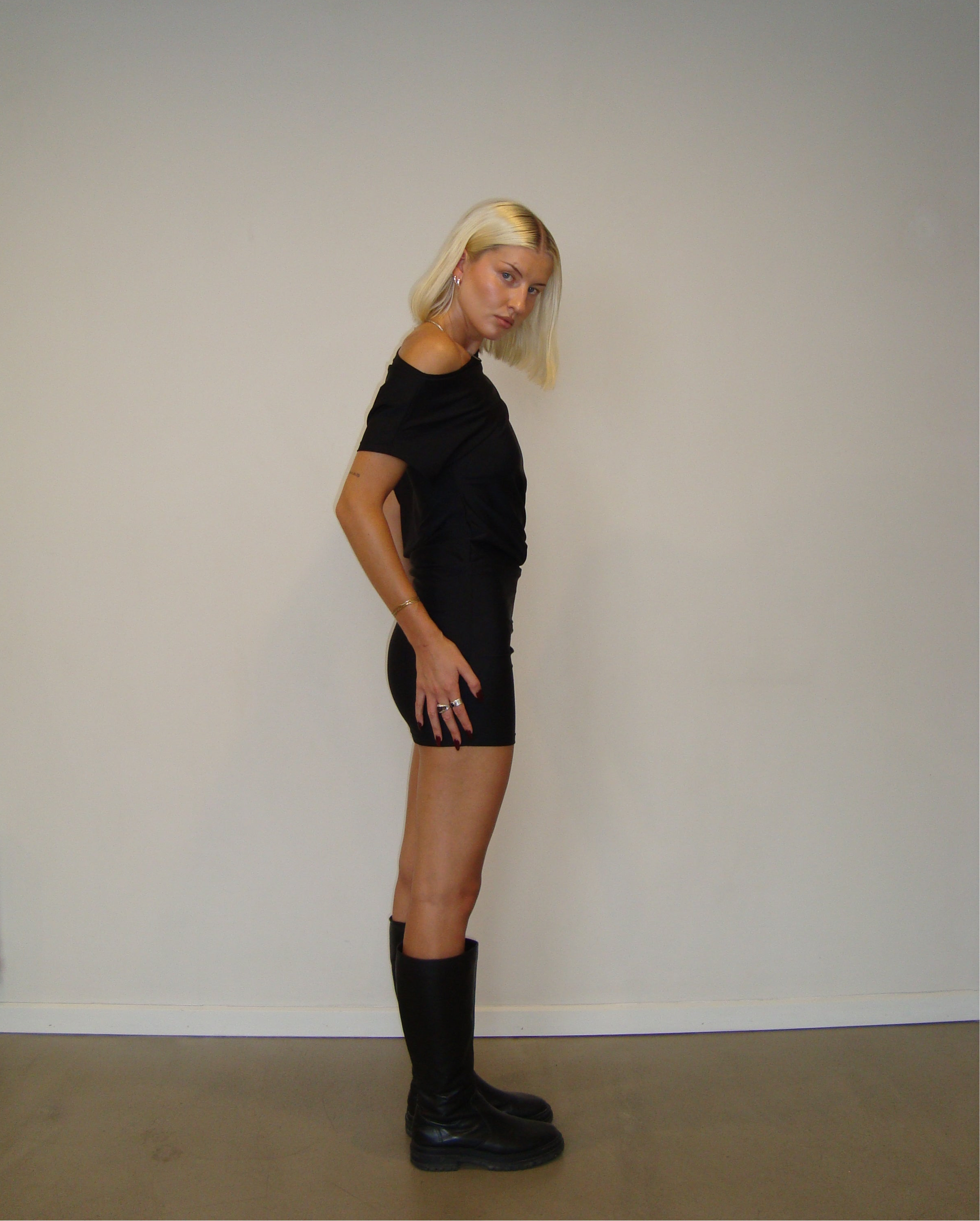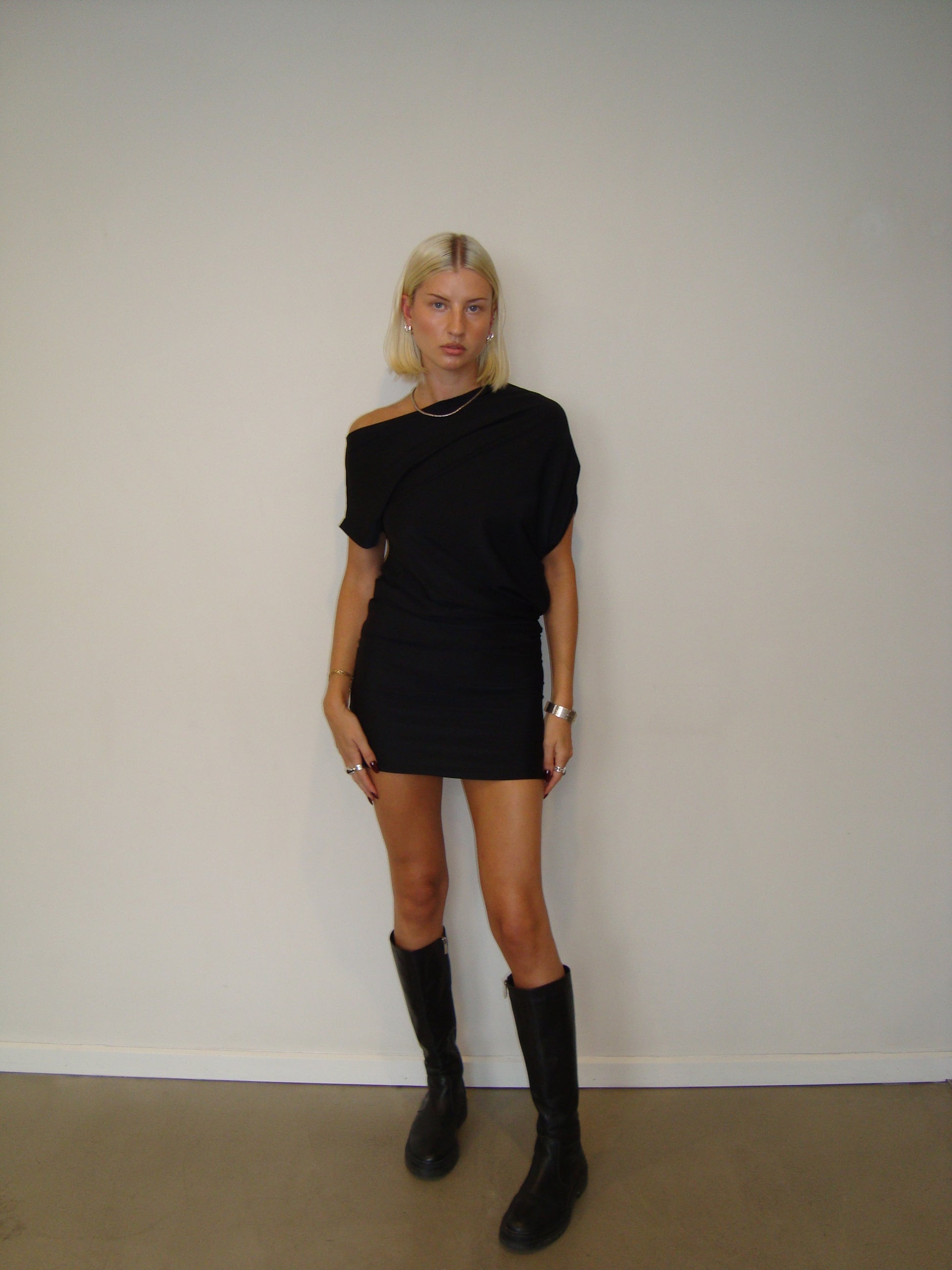 This dress features an off-the-shoulder design, cinched waist, and form-fitting silhouette for a timeless look. Crafted with a blend of black nylon and spandex, it offers a soft and comfortable feel.